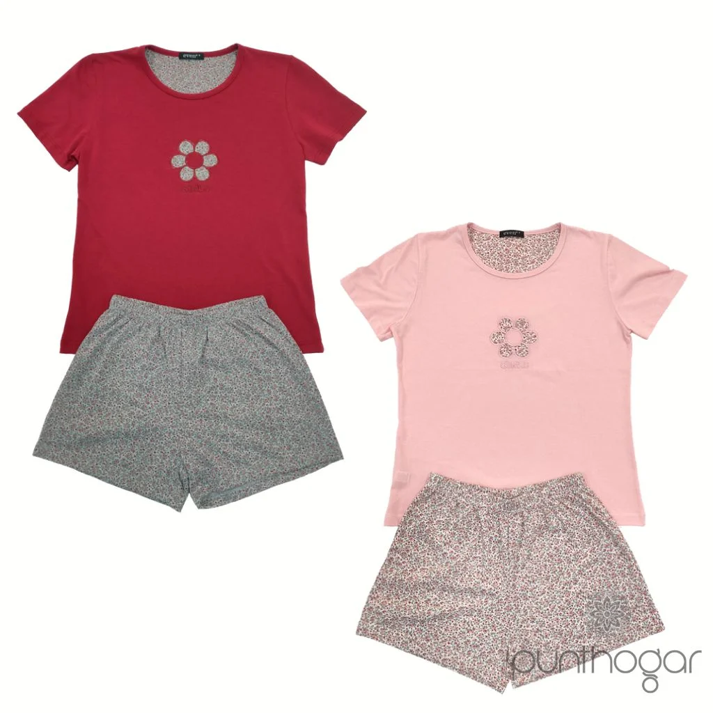 Pijama corto para niña marca Even dos piezas con camiseta manga corta lisa con flor en el pecho y pantalón estampado a juego.