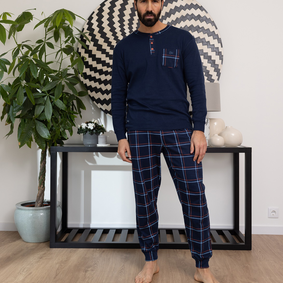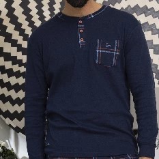 Camiseta de manga larga y cuello tapeta con 3 botones, puno, bolsillo y estampado en bolsillo y cuello.