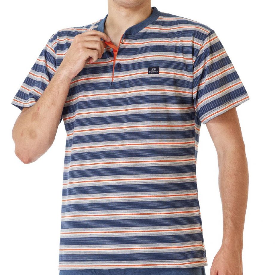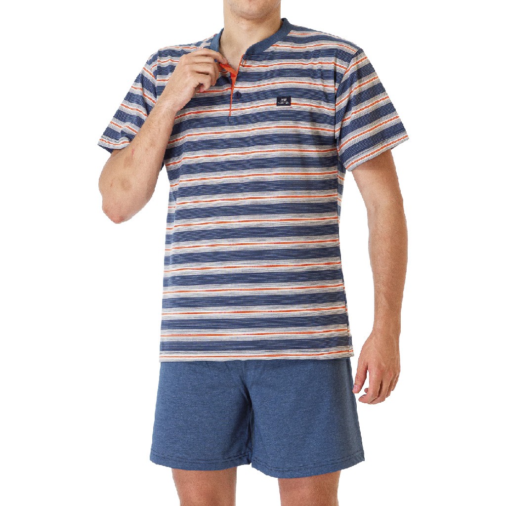 Pijama hombre de algodón verano .Camiseta de manga corta  a rayas con cuello redondo abotonado,pantalón corto liso en algodón .
