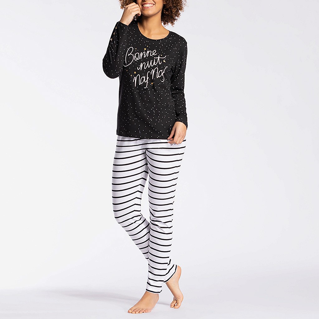 Pijama mujer compuesto por camiseta de manga larga en color negro con topitos estampados y logo de la marca impreso en el pecho que contrasta con pantalón largo a rayas. Marca Naf Naf. Se envía en cajita.