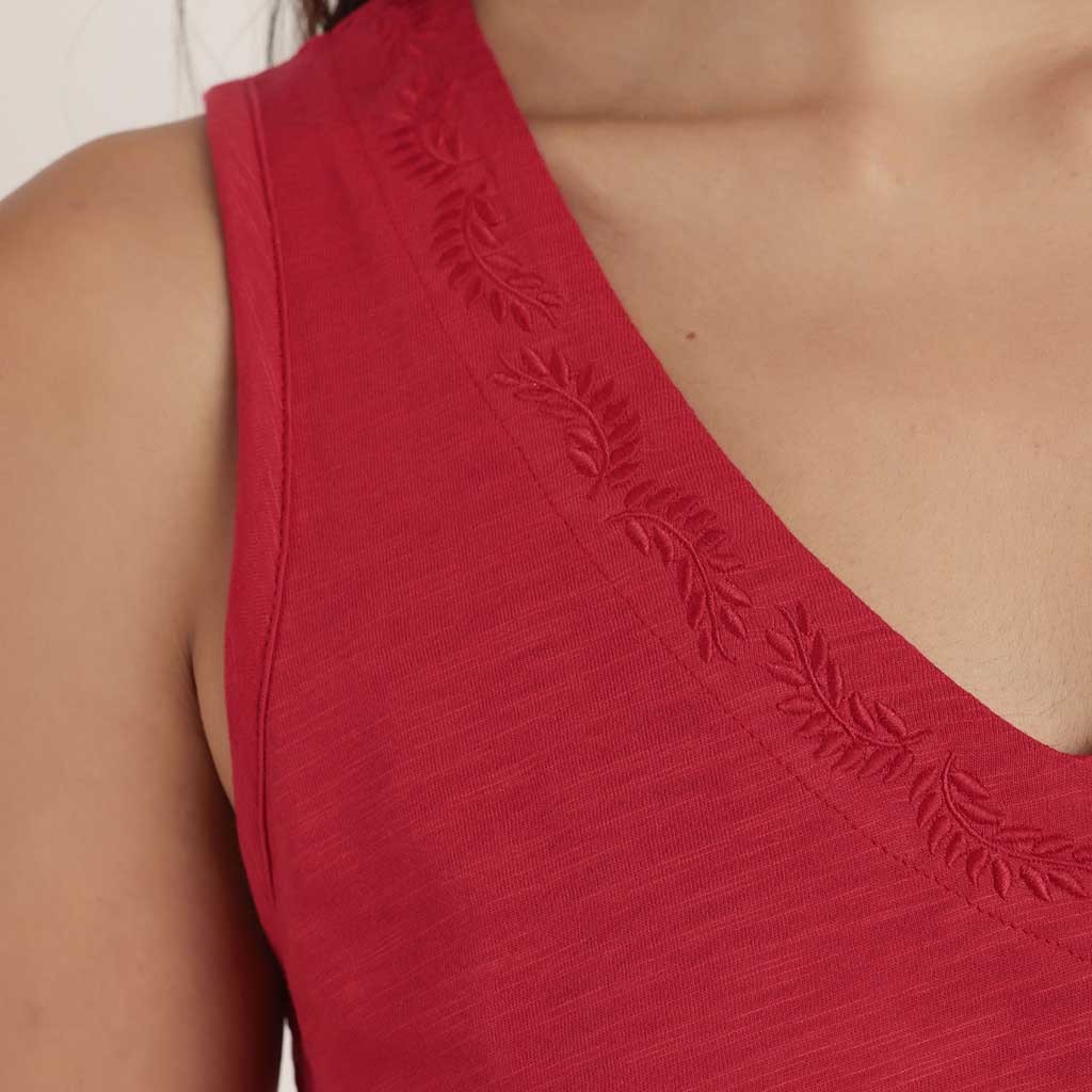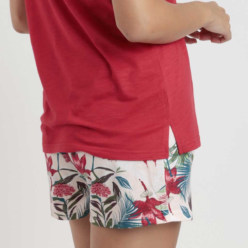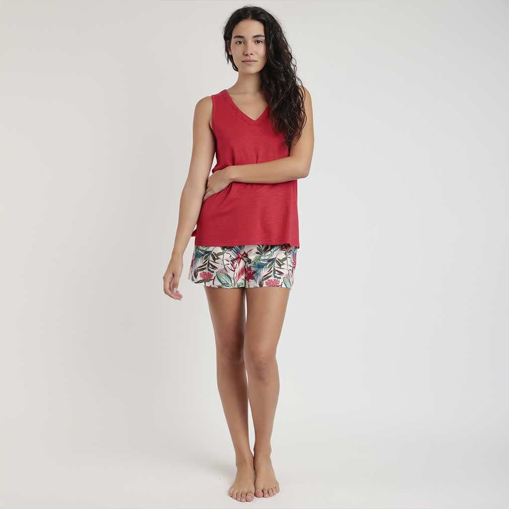 Pijama para mujer de la colección Garden, compuesto por camiseta de hombrera lisa con detalle bordado en el cuello y pantalón corto estampado, confeccionado todo en suave viscosa. Presentado en caja.