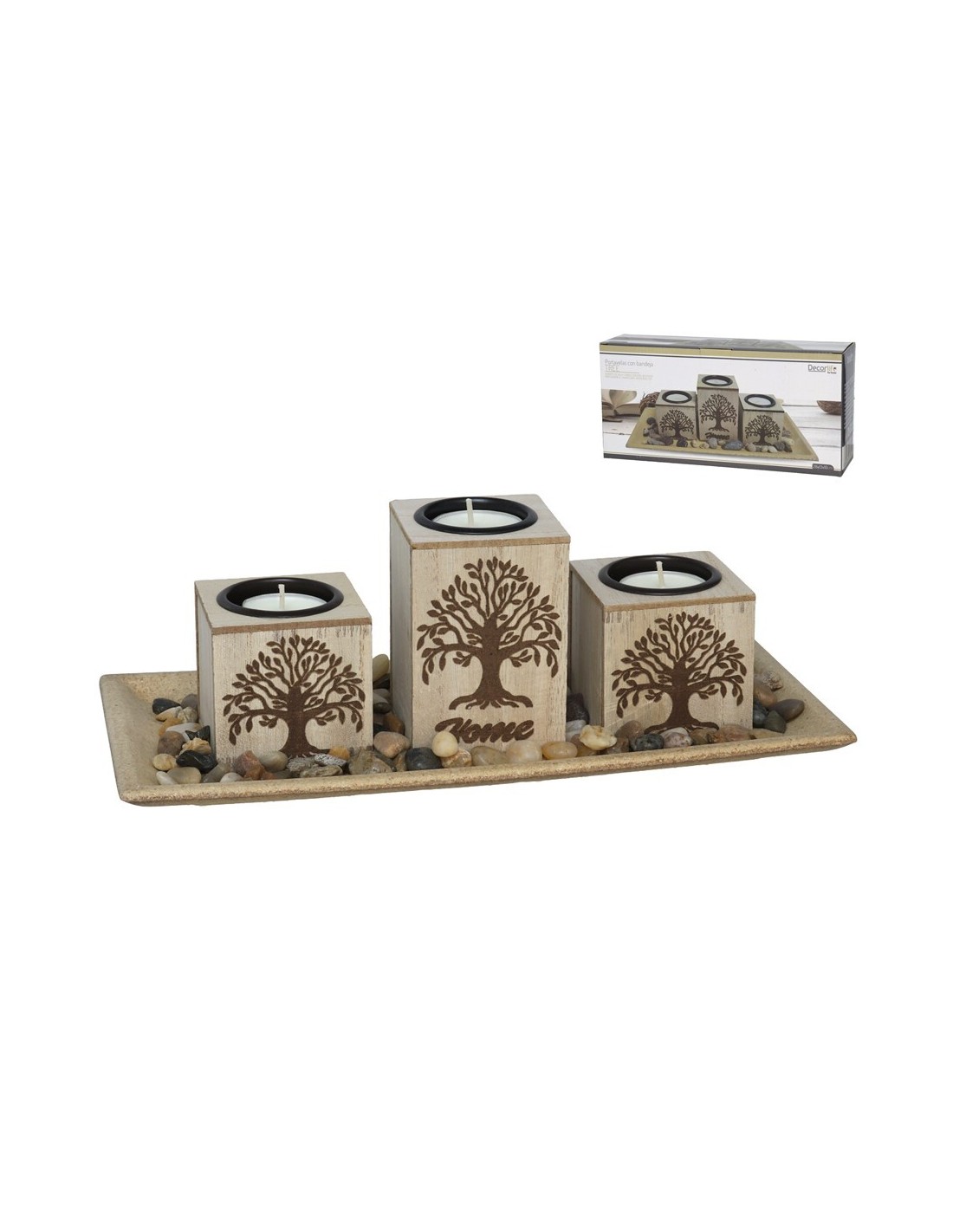 SET 3 PORTAVELAS TREE C/BANDEJA 28X13,5X10CM MADERA